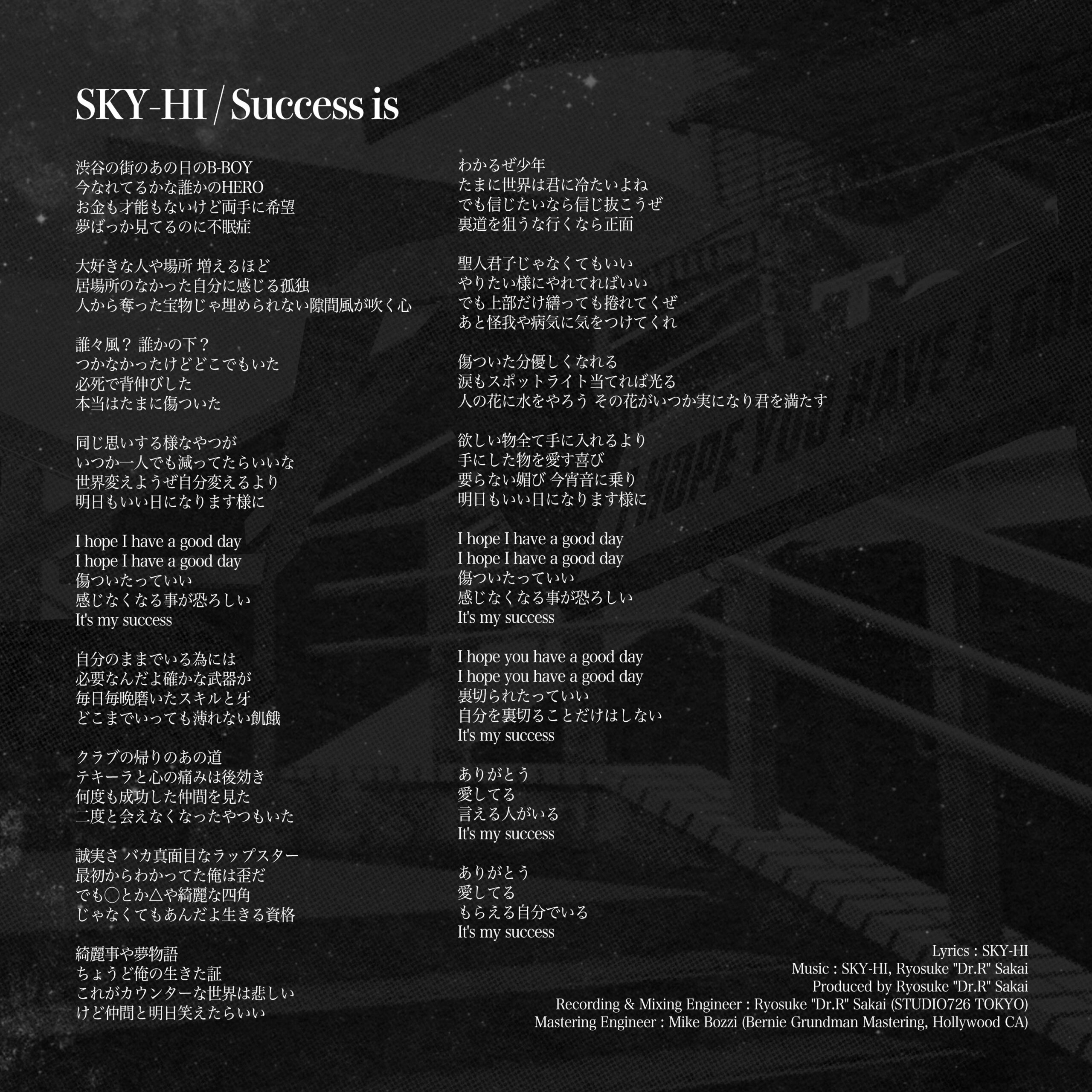 過去の痛みや葛藤を通し、自分自身を裏切らず誠実に生き、愛し、誰かを思いやる強さについて歌う本作は、ラッパー、プロデューサー、経営者として多面的に活動するSKY-HIが自らの人生を通して見出した“Success”の本質を静かに提示する1曲。